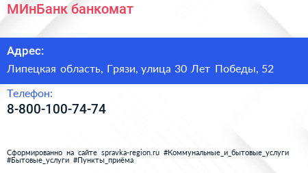 МИнБанк, банкомат по адресу Липецкая область, Грязи, улица 30 Лет Победы, 52 в дальнейшем Организация, размещена в следующих категориях: