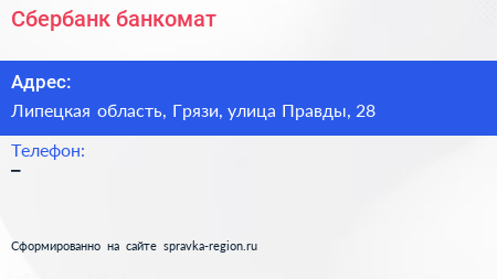 Сбербанк, банкомат по адресу Липецкая область, Грязи, улица Правды, 28 в дальнейшем Организация, размещена в следующих категориях: