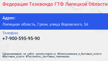 Федерация Тхэквондо ГТФ Липецкой Области по адресу Липецкая область, Грязи, улица Воровского, 56 в дальнейшем Организация, размещена в следующих категориях: