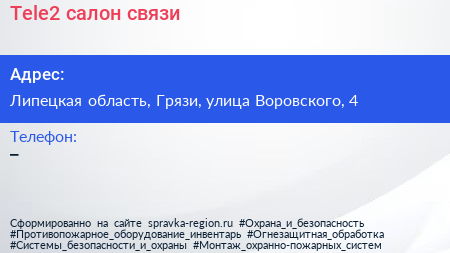 Tele2, салон связи по адресу Липецкая область, Грязи, улица Воровского, 4 в дальнейшем Организация, размещена в следующих категориях: