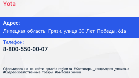 Yota по адресу Липецкая область, Грязи, улица 30 Лет Победы, 61а в дальнейшем Организация, размещена в следующих категориях: