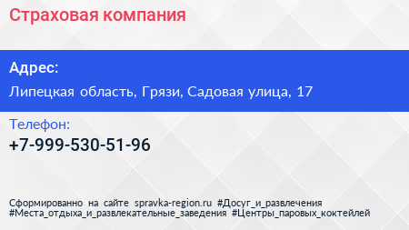 Страховая компания по адресу Липецкая область, Грязи, Садовая улица, 17 в дальнейшем Организация, размещена в следующих категориях: