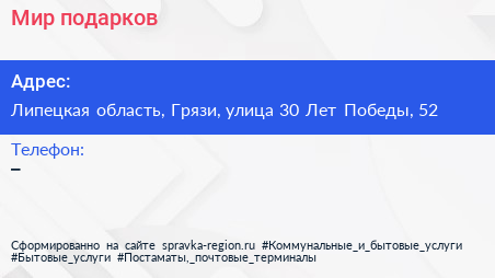 Мир подарков по адресу Липецкая область, Грязи, улица 30 Лет Победы, 52 в дальнейшем Организация, размещена в следующих категориях: