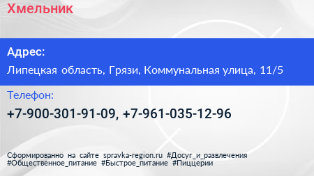 Хмельник по адресу Липецкая область, Грязи, Коммунальная улица, 11/5 в дальнейшем Организация, размещена в следующих категориях: