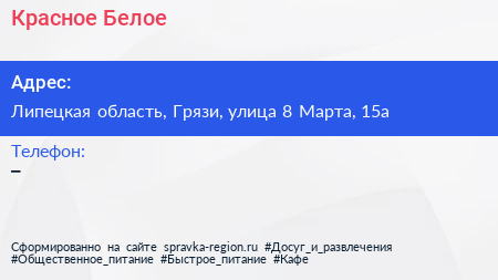 Красное & Белое по адресу Липецкая область, Грязи, улица 8 Марта, 15а в дальнейшем Организация, размещена в следующих категориях:
