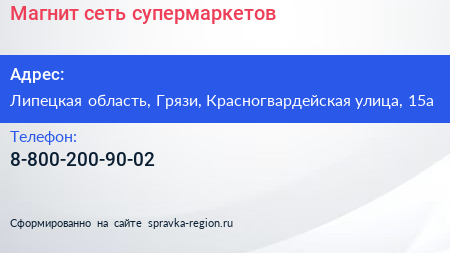 Магнит, сеть супермаркетов по адресу Липецкая область, Грязи, Красногвардейская улица, 15а в дальнейшем Организация, размещена в следующих категориях: