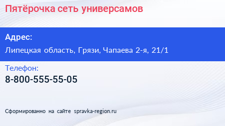 Пятёрочка, сеть универсамов по адресу Липецкая область, Грязи, Чапаева 2-я, 21/1 в дальнейшем Организация, размещена в следующих категориях: