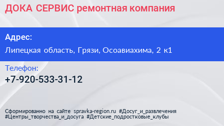 ДОКА-СЕРВИС, ремонтная компания по адресу Липецкая область, Грязи, Осоавиахима, 2 к1 в дальнейшем Организация, размещена в следующих категориях: