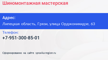 Шиномонтажная мастерская по адресу Липецкая область, Грязи, улица Орджоникидзе, 63 в дальнейшем Организация, размещена в следующих категориях: