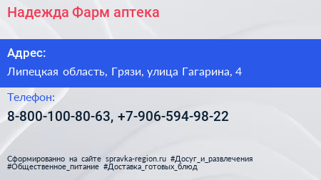 Надежда Фарм, аптека по адресу Липецкая область, Грязи, улица Гагарина, 4 в дальнейшем Организация, размещена в следующих категориях: