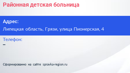 Районная детская больница по адресу Липецкая область, Грязи, улица Пионерская, 4 в дальнейшем Организация, размещена в следующих категориях:
