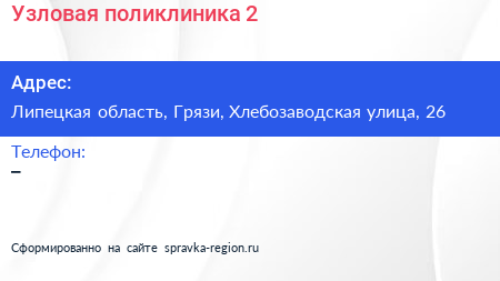 Узловая поликлиника №2 по адресу Липецкая область, Грязи, Хлебозаводская улица, 26 в дальнейшем Организация, размещена в следующих категориях: