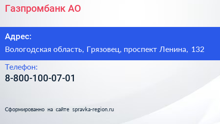 Газпромбанк, АО по адресу Вологодская область, Грязовец, проспект Ленина, 132 в дальнейшем Организация, размещена в следующих категориях: