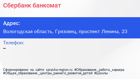 Сбербанк, банкомат по адресу Вологодская область, Грязовец, проспект Ленина, 23 в дальнейшем Организация, размещена в следующих категориях: