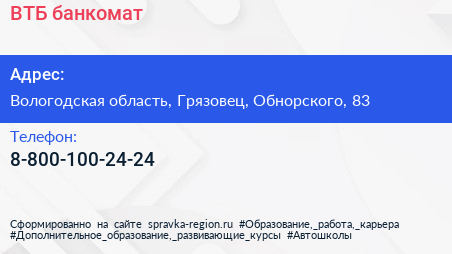 ВТБ, банкомат по адресу Вологодская область, Грязовец, Обнорского, 83 в дальнейшем Организация, размещена в следующих категориях: