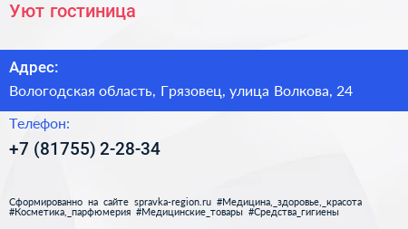 Уют, гостиница по адресу Вологодская область, Грязовец, улица Волкова, 24 в дальнейшем Организация, размещена в следующих категориях: