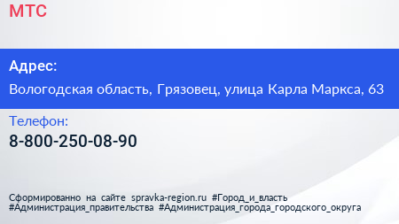 МТС по адресу Вологодская область, Грязовец, улица Карла Маркса, 63 в дальнейшем Организация, размещена в следующих категориях: