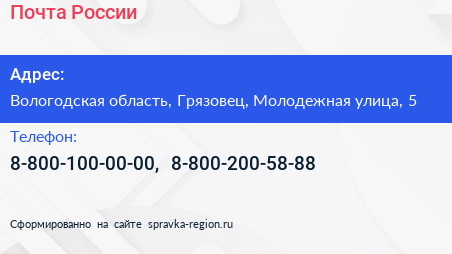 Почта России по адресу Вологодская область, Грязовец, Молодежная улица, 5 в дальнейшем Организация, размещена в следующих категориях: