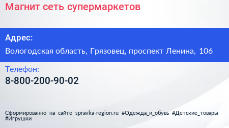 Магнит, сеть супермаркетов по адресу Вологодская область, Грязовец, проспект Ленина, 106 в дальнейшем Организация, размещена в следующих категориях: