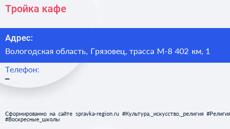 Тройка, кафе по адресу Вологодская область, Грязовец, трасса М-8 402 км, 1 в дальнейшем Организация, размещена в следующих категориях: