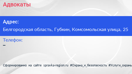 Адвокаты по адресу Белгородская область, Губкин, Комсомольская улица, 25 в дальнейшем Организация, размещена в следующих категориях: