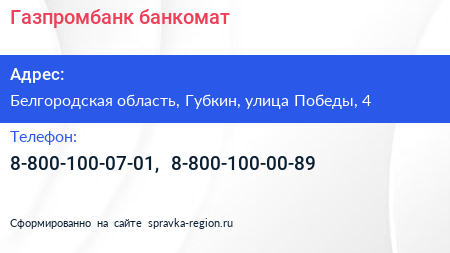 Газпромбанк, банкомат по адресу Белгородская область, Губкин, улица Победы, 4 в дальнейшем Организация, размещена в следующих категориях: