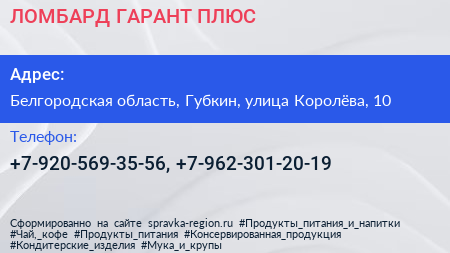 ЛОМБАРД ГАРАНТ ПЛЮС по адресу Белгородская область, Губкин, улица Королёва, 10 в дальнейшем Организация, размещена в следующих категориях: