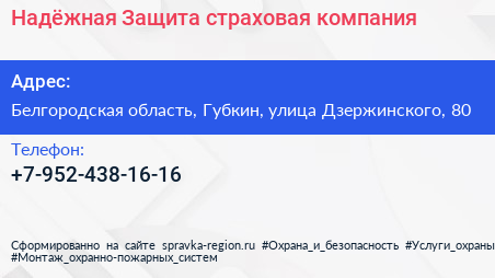Надёжная Защита, страховая компания по адресу Белгородская область, Губкин, улица Дзержинского, 80 в дальнейшем Организация, размещена в следующих категориях: