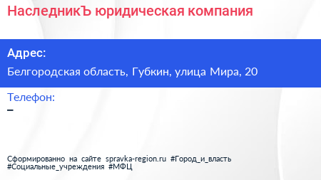 НаследникЪ, юридическая компания по адресу Белгородская область, Губкин, улица Мира, 20 в дальнейшем Организация, размещена в следующих категориях:
