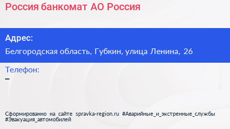 Россия, банкомат, АО Россия по адресу Белгородская область, Губкин, улица Ленина, 26 в дальнейшем Организация, размещена в следующих категориях: