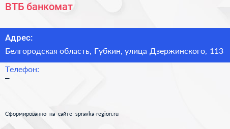 ВТБ, банкомат по адресу Белгородская область, Губкин, улица Дзержинского, 113 в дальнейшем Организация, размещена в следующих категориях: