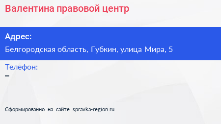 Валентина, правовой центр по адресу Белгородская область, Губкин, улица Мира, 5 в дальнейшем Организация, размещена в следующих категориях: