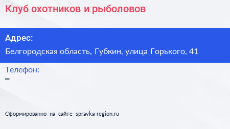 Клуб охотников и рыболовов по адресу Белгородская область, Губкин, улица Горького, 41 в дальнейшем Организация, размещена в следующих категориях: