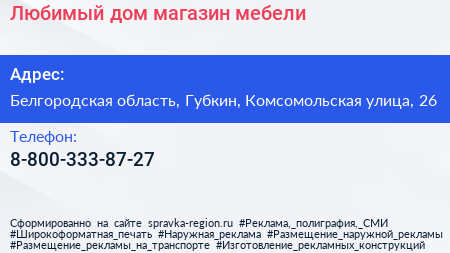 Любимый дом, магазин мебели по адресу Белгородская область, Губкин, Комсомольская улица, 26 в дальнейшем Организация, размещена в следующих категориях: