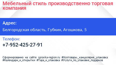 Мебельный стиль, производственно-торговая компания по адресу Белгородская область, Губкин, Агошкова, 5 в дальнейшем Организация, размещена в следующих категориях: