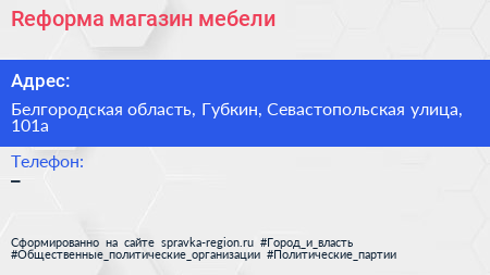 Reформа, магазин мебели по адресу Белгородская область, Губкин, Севастопольская улица, 101а в дальнейшем Организация, размещена в следующих категориях: