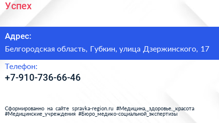 Успех по адресу Белгородская область, Губкин, улица Дзержинского, 17 в дальнейшем Организация, размещена в следующих категориях: