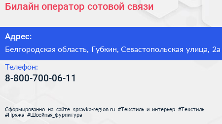 Билайн, оператор сотовой связи по адресу Белгородская область, Губкин, Севастопольская улица, 2а в дальнейшем Организация, размещена в следующих категориях: