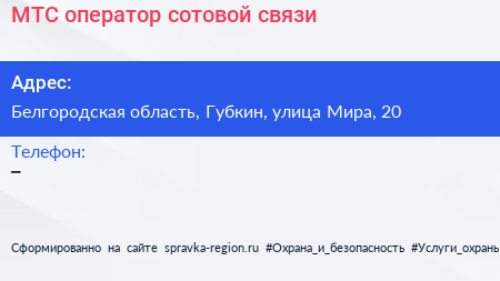 МТС, оператор сотовой связи по адресу Белгородская область, Губкин, улица Мира, 20 в дальнейшем Организация, размещена в следующих категориях: