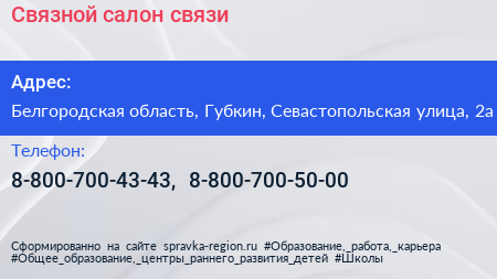 Связной, салон связи по адресу Белгородская область, Губкин, Севастопольская улица, 2а в дальнейшем Организация, размещена в следующих категориях: