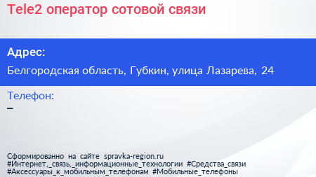 Tele2, оператор сотовой связи по адресу Белгородская область, Губкин, улица Лазарева, 24 в дальнейшем Организация, размещена в следующих категориях: