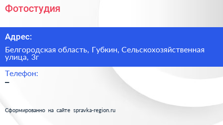 Фотостудия по адресу Белгородская область, Губкин, Сельскохозяйственная улица, 3г в дальнейшем Организация, размещена в следующих категориях: