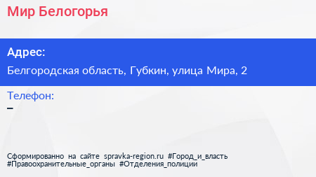 Мир Белогорья по адресу Белгородская область, Губкин, улица Мира, 2 в дальнейшем Организация, размещена в следующих категориях: