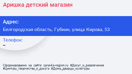 Аришка, детский магазин по адресу Белгородская область, Губкин, улица Кирова, 53 в дальнейшем Организация, размещена в следующих категориях: