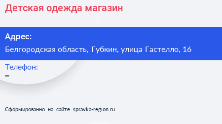 Детская одежда, магазин по адресу Белгородская область, Губкин, улица Гастелло, 16 в дальнейшем Организация, размещена в следующих категориях: