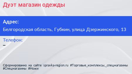 Дуэт, магазин одежды по адресу Белгородская область, Губкин, улица Дзержинского, 13 в дальнейшем Организация, размещена в следующих категориях: