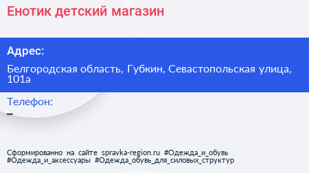 Енотик, детский магазин по адресу Белгородская область, Губкин, Севастопольская улица, 101а в дальнейшем Организация, размещена в следующих категориях: