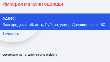 Империя, магазин одежды по адресу Белгородская область, Губкин, улица Дзержинского, 80 в дальнейшем Организация, размещена в следующих категориях: