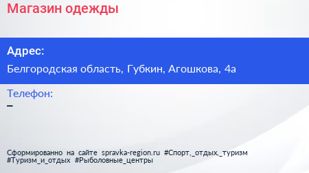 Магазин одежды по адресу Белгородская область, Губкин, Агошкова, 4а в дальнейшем Организация, размещена в следующих категориях: