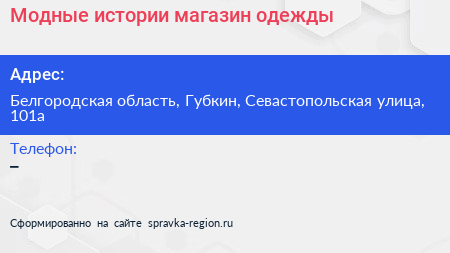 Модные истории, магазин одежды по адресу Белгородская область, Губкин, Севастопольская улица, 101а в дальнейшем Организация, размещена в следующих категориях: